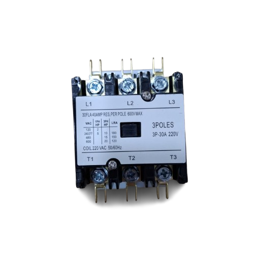 کنتاکتور سه فاز (3پل) 3P-30A-220V دارای “جریان اسمی 30 آمپر”، “فرکانس 50/60Hz” و “ولتاژ بوبین 240-208 ولت” می‌باشد.